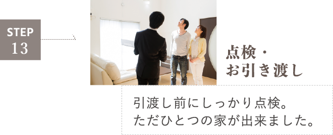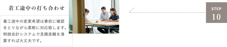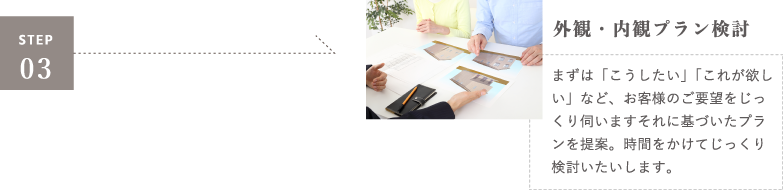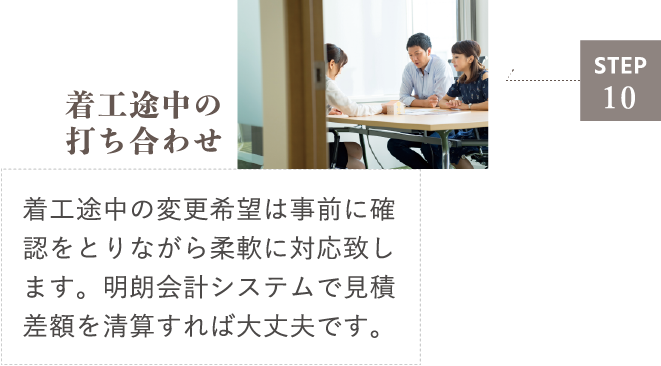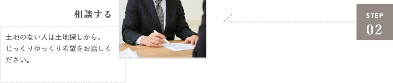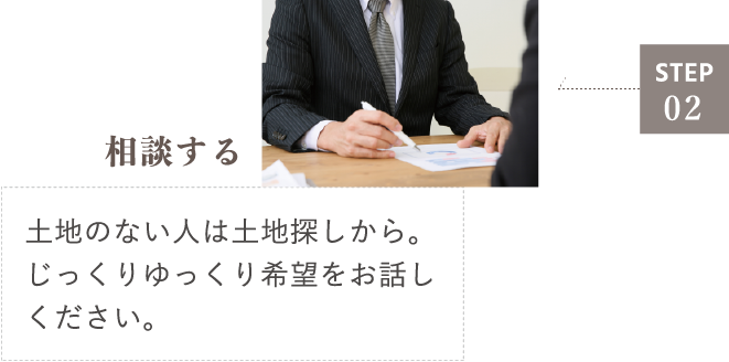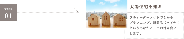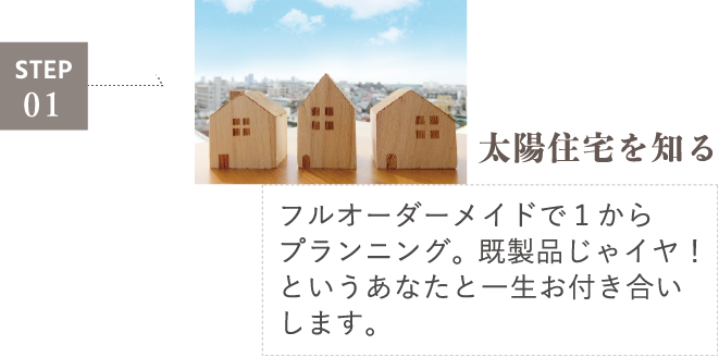 Flow施工の流れ 世界にただひとつのお客様の家を建てる。まずは「こうしたい」「これが欲しい」など、お客様のご要望をじっくり伺います。土地がなければ土地探しから、土地の形も違えば周りの環境もライフスタイルも住人十色。家に合わせて住むのではなく、自分にあった自分らしい家を建てませんか?真っ白いキャンバスに1から描き上げるように太陽住宅は「あなただけの住まいづくり」に全力を注ぎます。