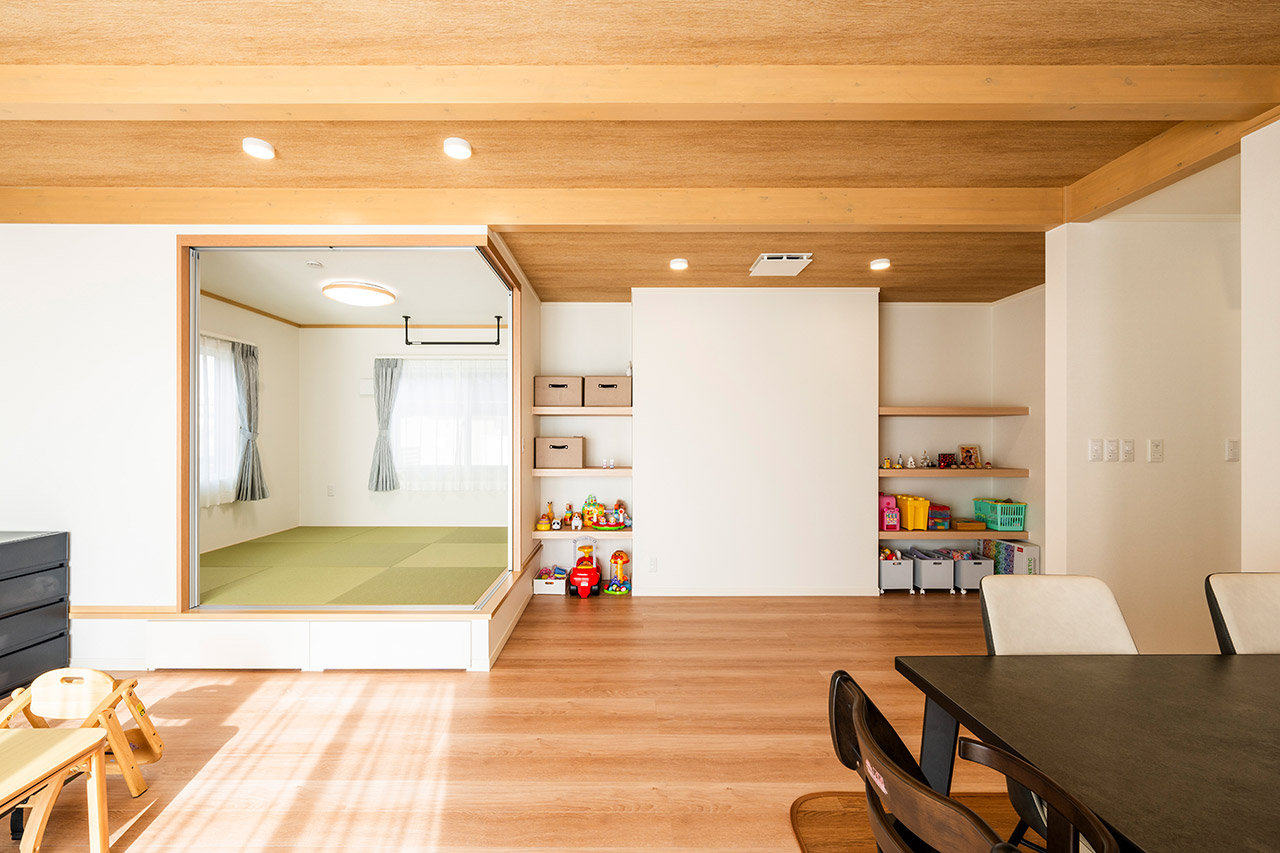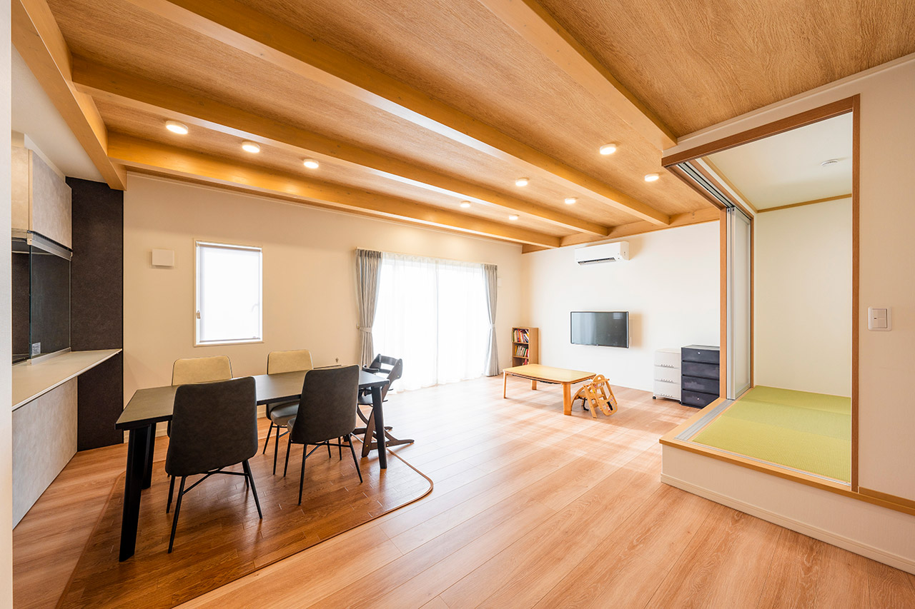 南向きの窓からの採光が抜群で、明るく開放的なLDK。リビングの横に小上がりの畳スペースを設けたことで、腰掛けたり、寝転んだりとくつろげる場所になりました。