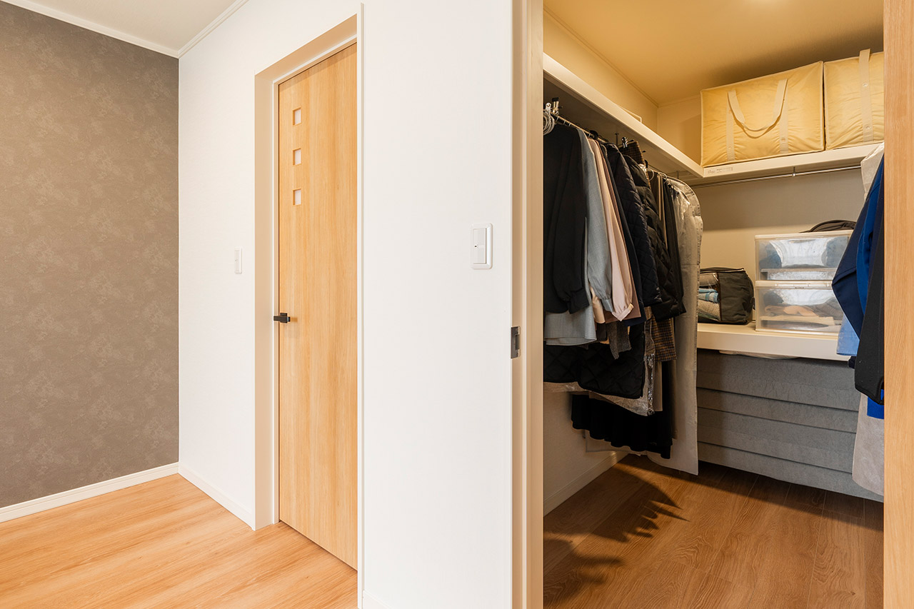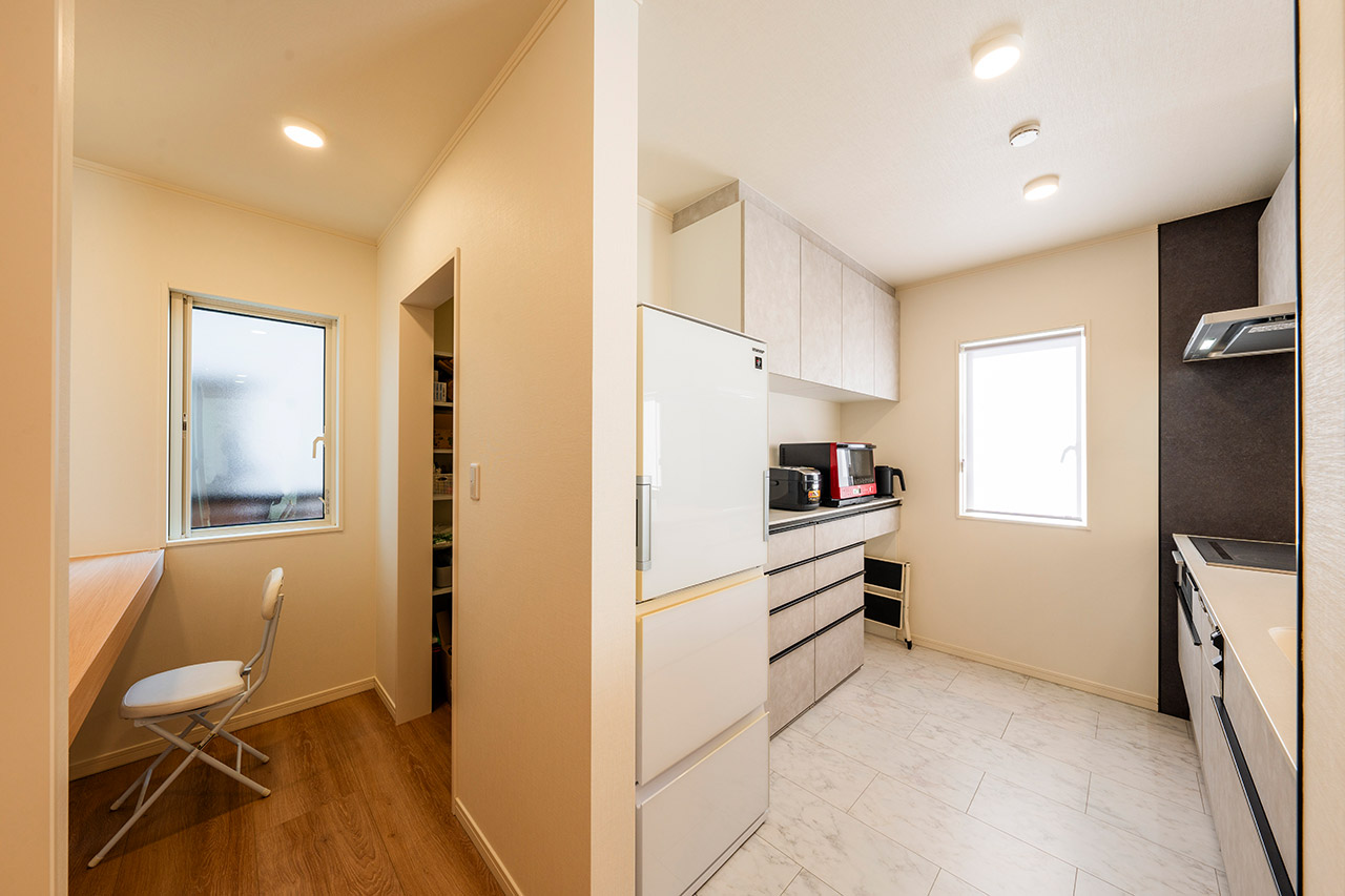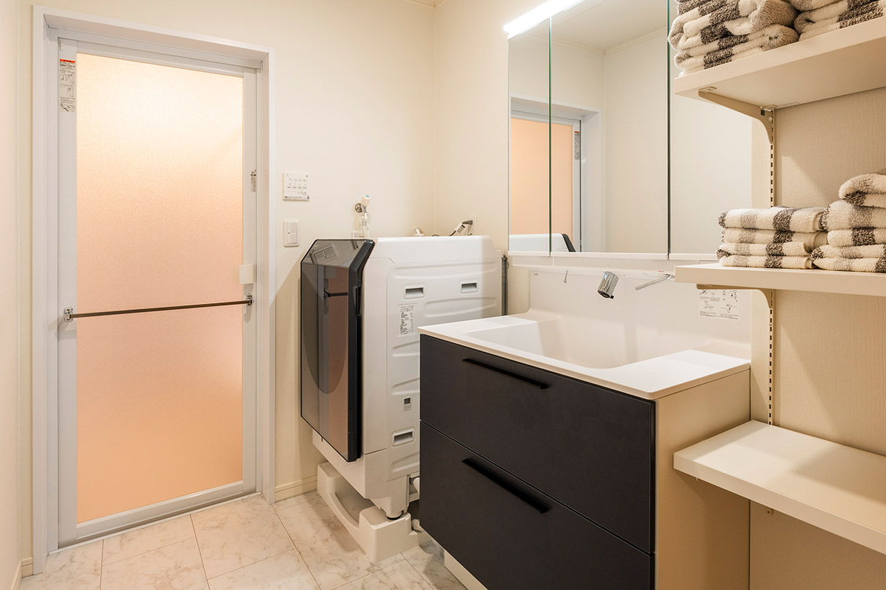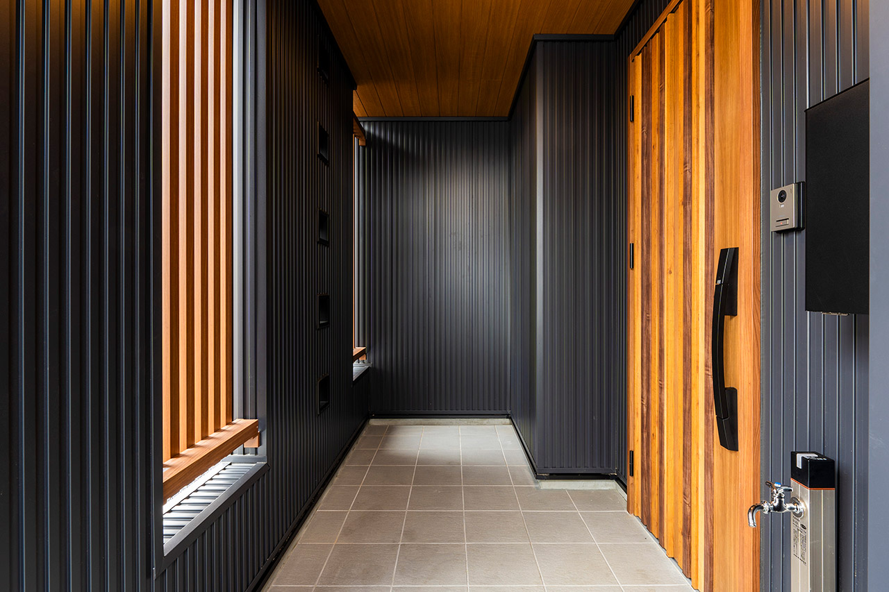 水回りはモノトーンで色を抑え、黒をアクセントに使いメリハリのある空間に仕上げています。また、木目調の玄関ドアや縦格子などが、外壁と調和してシャープな中にも柔らかな雰囲気を与えています。